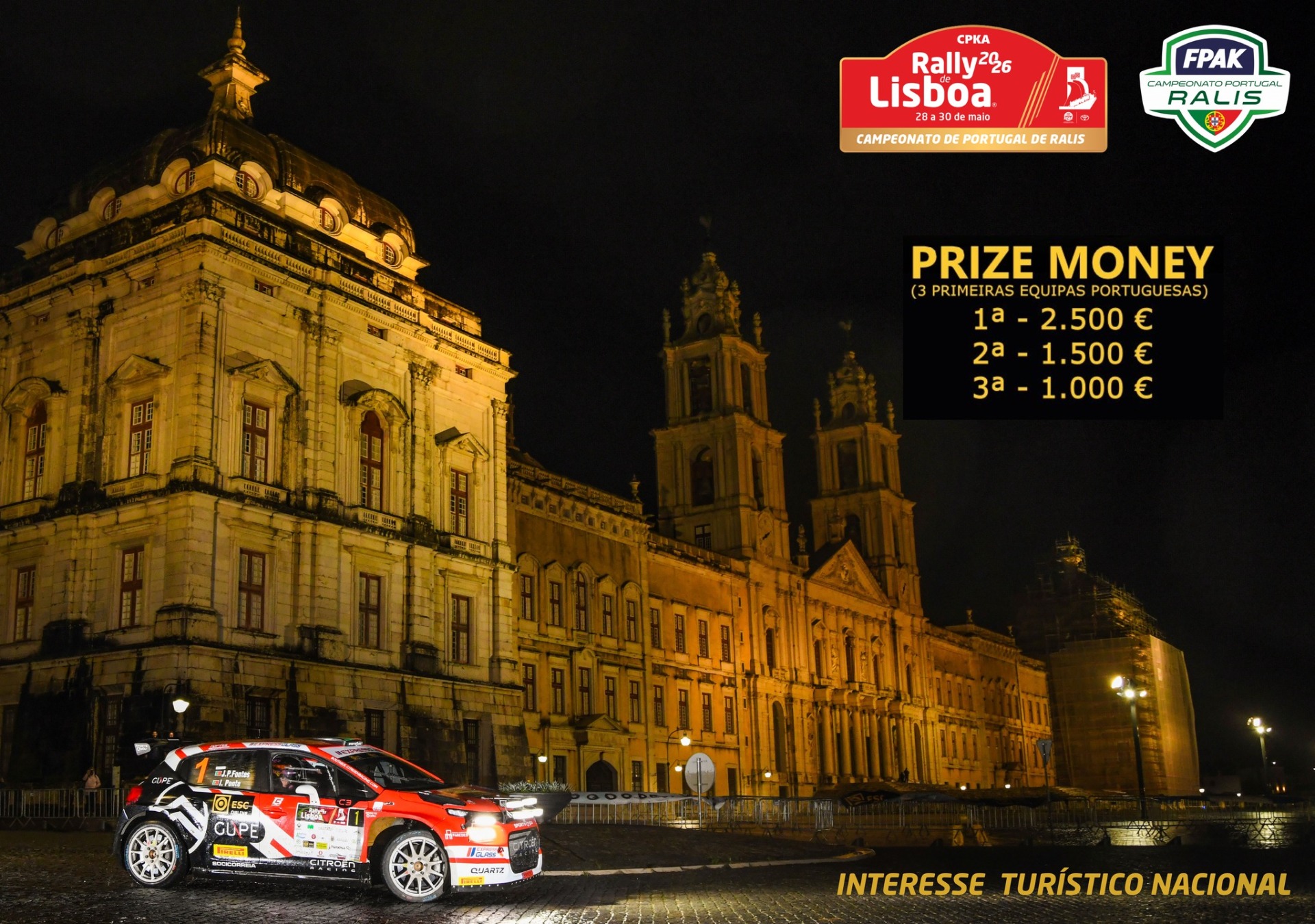 O Rally de Lisboa, a 3ª prova do Campeonato de Portugal de Ralis de 2026 vai atribuir um Prize Money no montante de €5.000 aos três concorrentes portugueses melhor classificados.